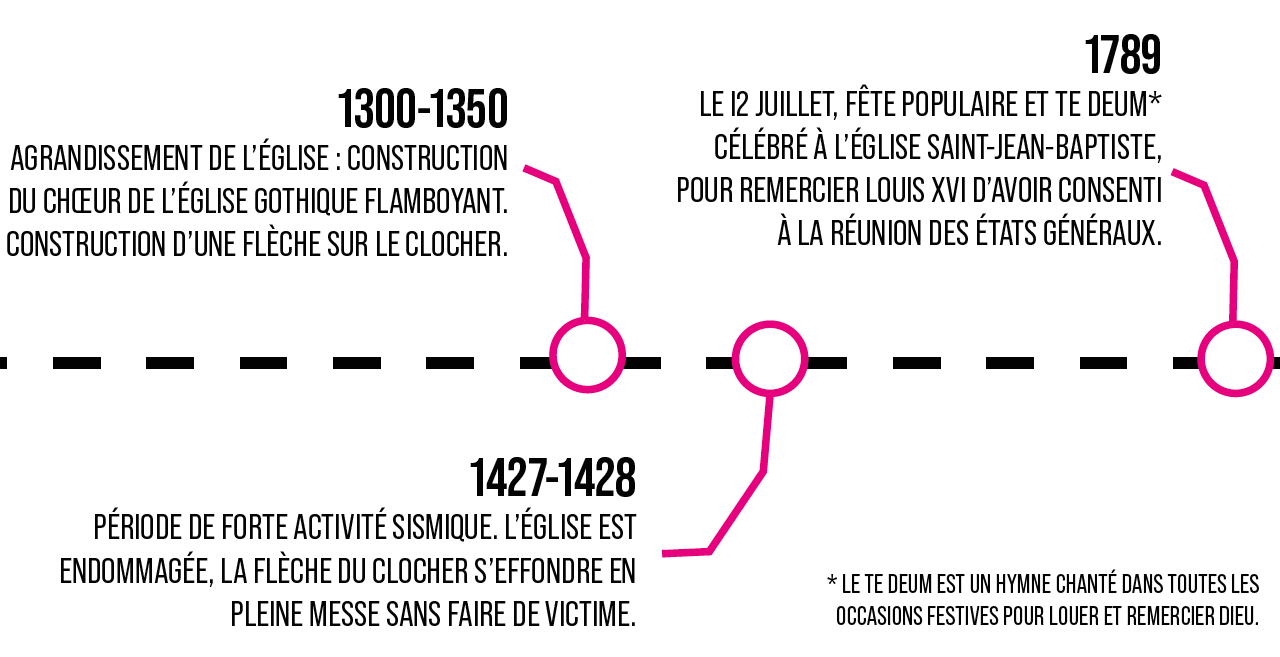 En 1427, un tremblement de terre occasionne d’importants dégâts, avec notamment l’effondrement de la flèche du clocher qui ne sera pas reconstruite. Une fois les dommages sismiques réparés, l’église ne connaîtra pas d’autres