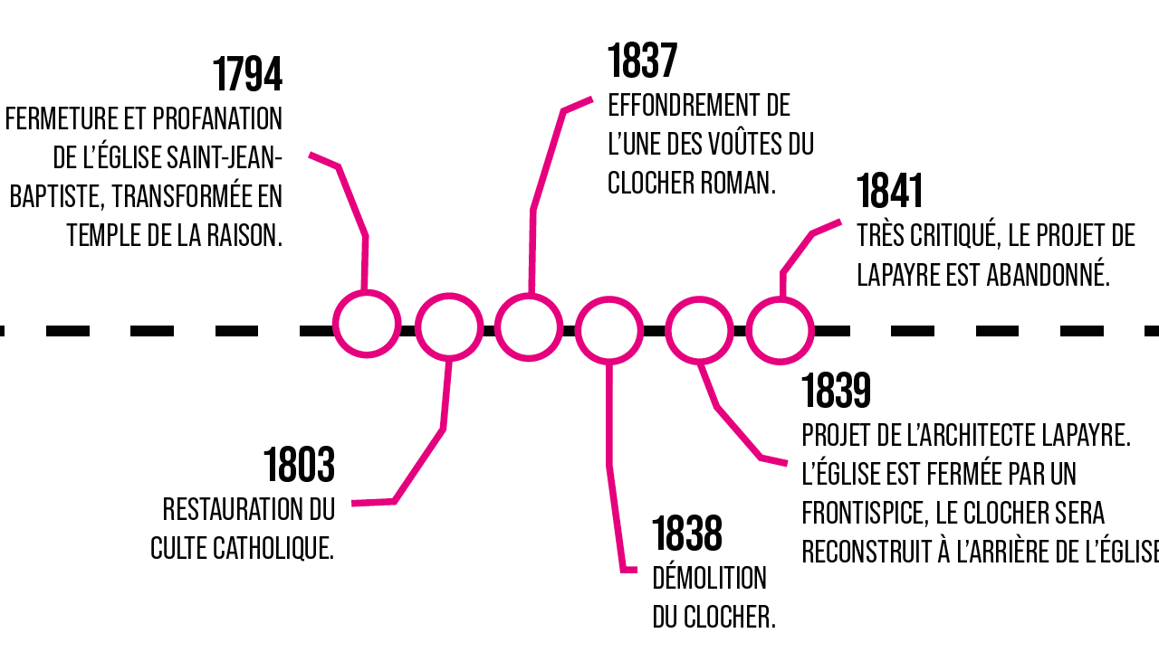 Les dommages du tremblement de terre de 1427 ainsi qu’un entretien insuffisant depuis le XVIIIe siècle auront finalement raison du clocher roman qui s’effondre en partie en 1837.