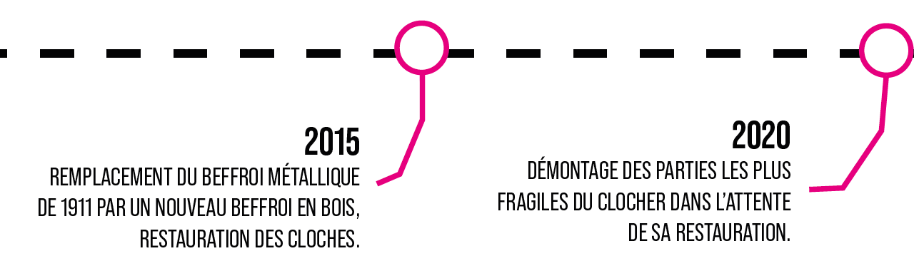 Cependant, le nouveau clocher s’avère fragile. En 1892 une première campagne de travaux est engagée, d’autres suivront. En 1911, un beffroi métallique remplace le beffroi initial en bois.