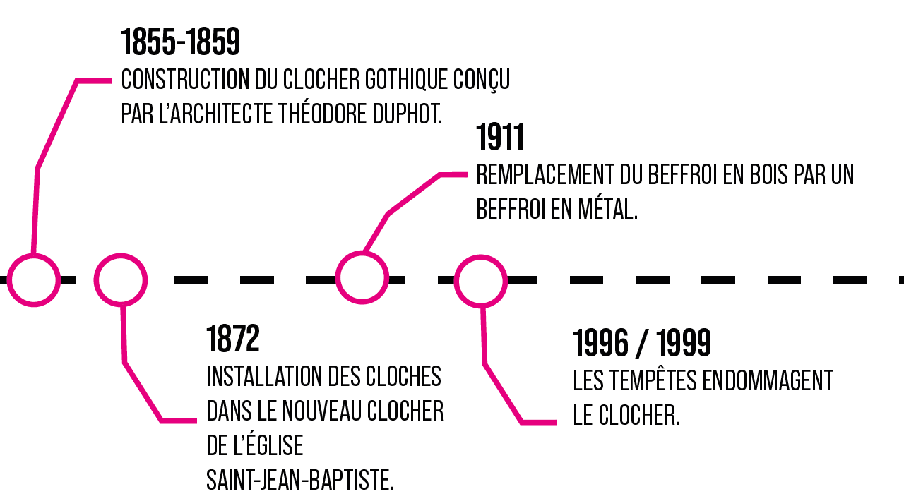 À l’intérieur du clocher, la construction du beffroi (la charpente qui supporte les cloches) a lieu en 1872. Elle est suivie la même année de l’installation de six cloches qui parachève les travaux externes de l’édifice tandis que les aménagements intérieurs, mobiliers, boiseries, vitraux, installation des chapelles, se poursuivront jusqu’en 1910.