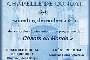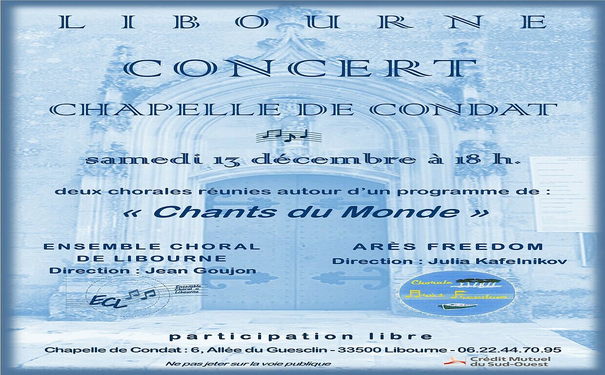 Le13déc.Du 18:00 à 20:00 SALLE de la Chapelle de CONDAT Allées du Guesclin 33500 libourne 33500 LibourneMusique / ConcertConcertChapelle de CondatDates complémentaires : 13/12/2025, 18:00 - 20:00 Ajouter à mon calendrierSélection de la vueFermerPrécédentRetour à la listeSuivant