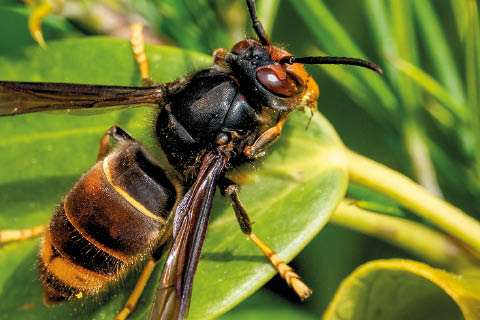 - Les pattes du frelon asiatique sont bicolores : noires près du thorax et jaunes à l’extrémité.